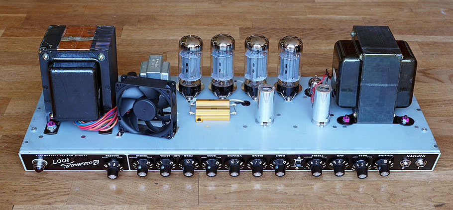 Signalverstärkung zuständig ist, arbeiten im 100T vier Endstufenröhren des Typs 6L6 und dicke Trafos (natürlich zu Lasten des Gewichts...)